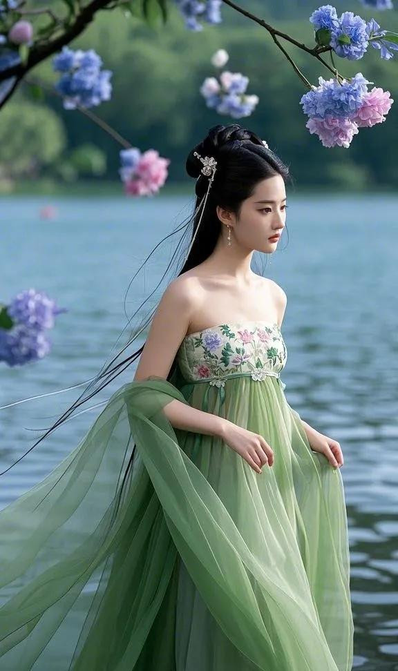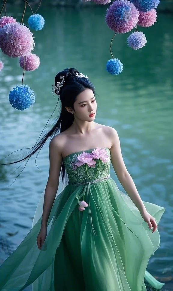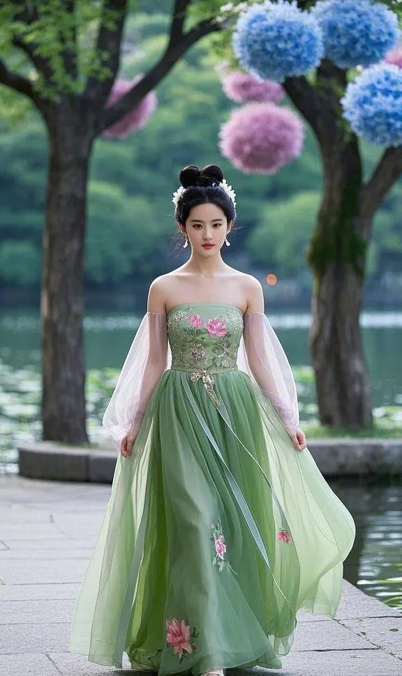 绿色裙摆似山间流淌的清泉,又像春日蓬勃的翠林,灵动且充满生机。收腰设计完美勾勒出她纤细的腰肢,裙子随风飘舞。精致的刺绣如繁花绽于裙身,细腻纹理诉说着古老匠艺的魅力。